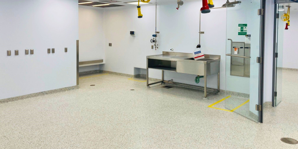 Los pisos sin juntas, vertidos in situ y con zócalos cóncavos lo hacen posible. La durabilidad del piso sin juntas debe ser suficiente para evitar que se dañe. Se deben realizar los detalles adecuados para eliminar salientes y esquinas y garantizar que no se acumule suciedad ni bacterias.