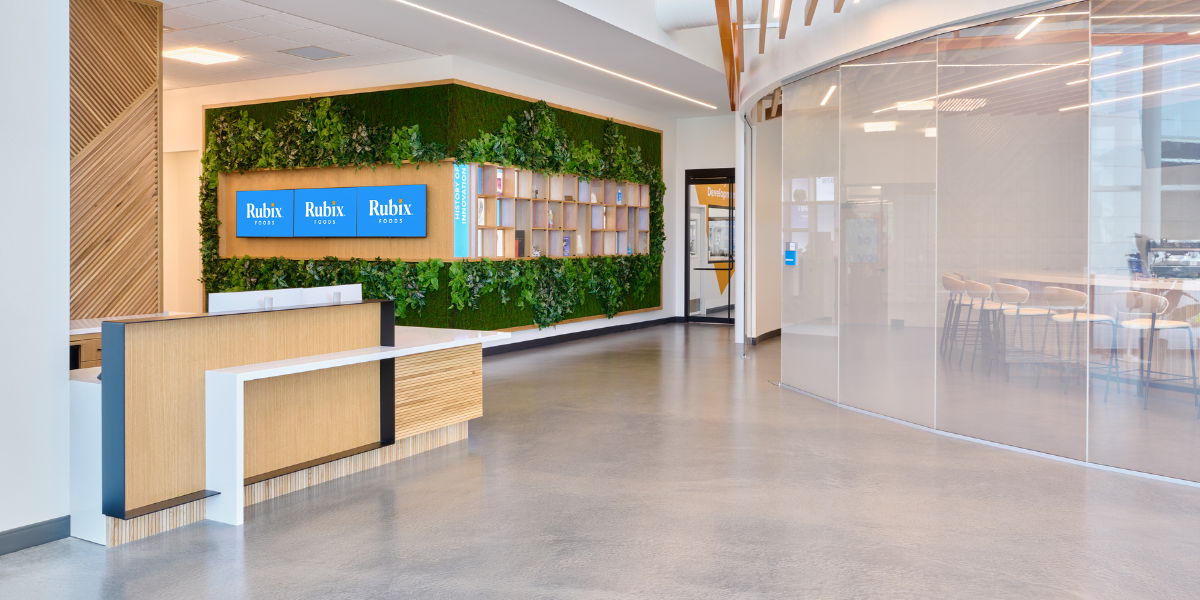 El sistema de pisos Reflect realza el vestíbulo de Rubix Foods con un acabado metálico sin juntas, creando un espacio elegante y duradero para visitantes y empleados.